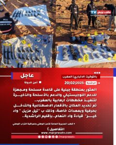 وقد مكنت عمليات التفتيش والتمشيط, التي استغرقت أكثر من ثلاث ساعات تقريبا، من العثور على شحنة من الأسلحة والذخيرة النارية مدفونة في مكان منزو أسفل المرتفع الصخري، كانت ملفوفة في أكياس بلاستيكية وجرائد ورقية منشورة بدولة مالي، من بينها أسبوعيات ورقية صادرة بتاريخ 27 يناير 2025.