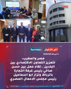 الاجتماع شكل فرصة لبحث سبل تعزيز التعاون الاقتصادي والتجاري بين المغرب ومصر، واستعراض افاق تطوير العلاقات بين الفاعلين الاقتصاديين في البلدين.