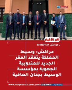 مراكش-قام السيد حسن طارق، وسيط المملكة، مساء يوم الخميس 23 أبريل 2026، بزيارة تفقدية للمقر الجديد للمندوبية الجهوية لمؤسسة الوسيط بمدينة مراكش، الكائن بحي جنان العافية بسيدي يوسف بن علي، حيث اطلع على مختلف مرافق البناية والتجهيزات الموضوعة رهن إشارة المندوبية، وذلك في أفق توفير أفضل الظروف الملائمة للاضطلاع بمهامها المرتبطة باستقبال ومعالجة التظلمات.