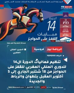 الرباط – تنطلق فعاليات الدورة الرابعة عشرة للدوري الملكي المغربي للقفز على الحواجز يوم 18 شتنبر الجاري وتستمر إلى غاية خامس أكتوبر المقبل بكل من مدن تطوان والرباط والجديدة.