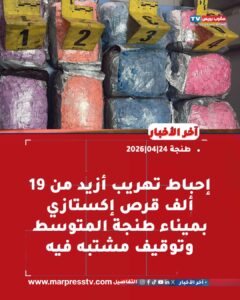 تمكنت عناصر الأمن الوطني والجمارك بميناء طنجة المتوسط، زوال يوم الخميس 23 أبريل الجاري، من إحباط محاولة للتهريب الدولي لشحنة من المؤثرات العقلية، بلغت 19 ألفا و100 قرص مهلوس من نوع “إكستازي”.