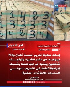 إحباط محاولة تهريب خمسة أطنان و758 كيلوغراما من مخدر الشيرا، وتوقيف شخصين يشتبه في ارتباطهما بشبكة إجرامية تنشط في التهريب الدولي للمخدرات والمؤثرات العقلية